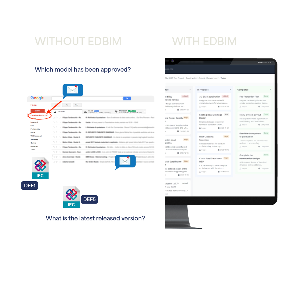 EDBIM combina un CDE e una piattaforma collaborativa in un unico ambiente per gestire tutte le informazioni del processo edilizio.